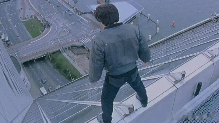 最让人揪心的还是1998年拍《我是谁》,在鹿特丹的通泰大楼,他要从21楼的外墙往下滑。