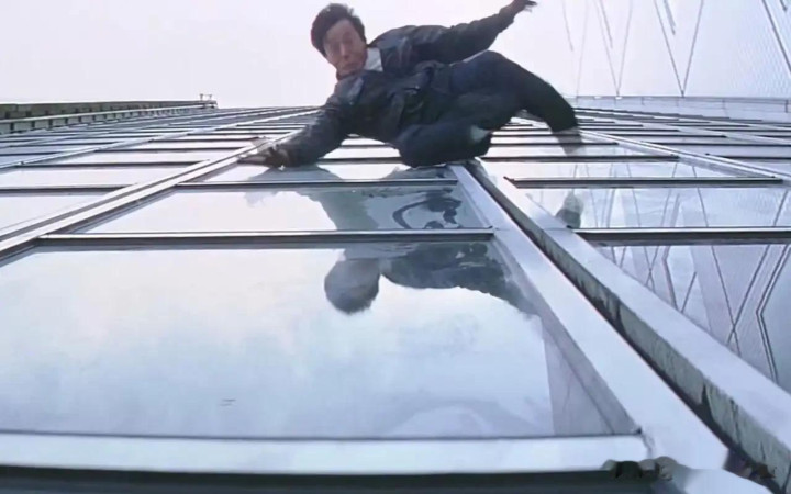 1985年的《警察故事》,现在看还是动作片的标杆,片里有段戏,成龙要从商场四楼跳下来,抓着吊灯滑到一楼,再撞碎玻璃门落在一堆钢架上。